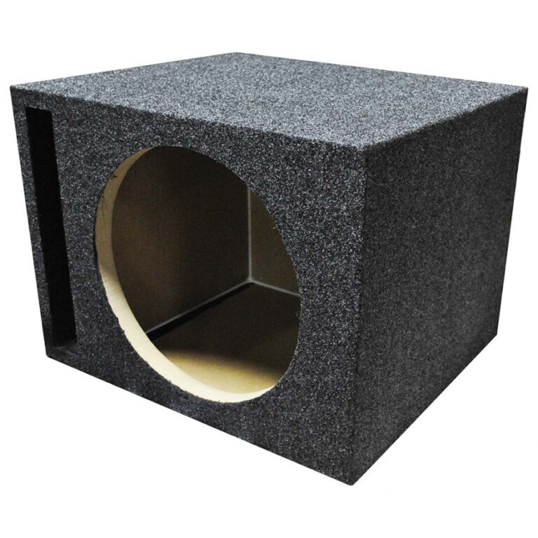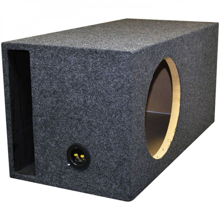 QPOWER SINGLE 12IN SHALLOW SEALED 15.75? WIDE X 13? HIGH X 13? DEEP 3/4? MDF FRONT + 5/8? MDF SIDES CHARCOAL CARPET SPRING LOADED PUSH PIN TERMINALS 1.05 CUBIC FT. 11-1/2? MOUNTING DEPTH | ||