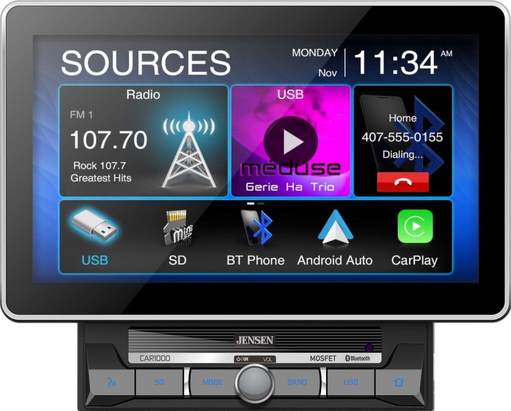 JENSEN CAR1000 10″ TOUCHSCREEN,2 DIN MECHLESS, 200 WATTS, – APPLE CARPLAY/ANDROID AUTO, BLUETOOTH